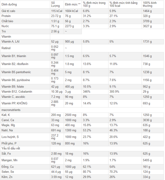 - Protein: Cua tuyết là một nguồn protein chất lượng cao. Protein là thành phần cần thiết để xây dựng và duy trì các tế bào, mô cơ, và hệ thống miễn dịch của cơ thể.