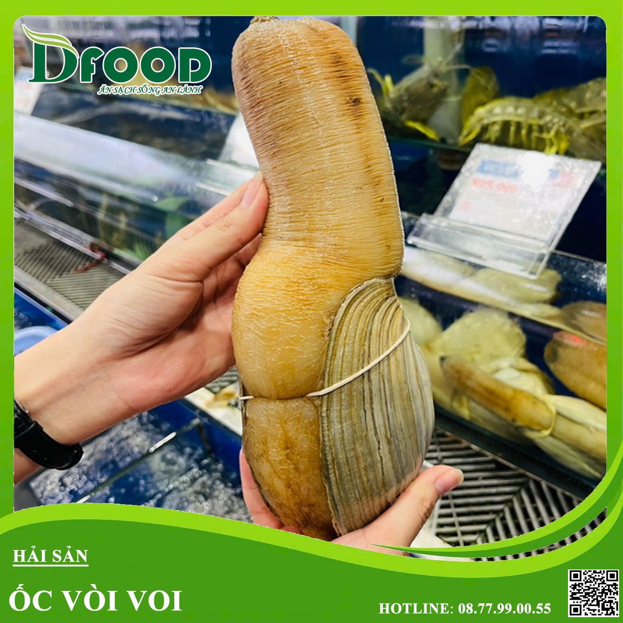 Ốc vòi voi Canada (Tu hài Canada) được Hải sản tươi sống Dfood nhập khẩu từ Canada: là một loại ốc có kích thước lớn nhất thế giới, môi trường sống của chúng là ẩn nấp trong những hang cát, hay các bãi bùn cửa sông nước lợ. Hiện tại ốc vòi voi Canada là thượng phẩm có giá trị kinh tế cũng như dinh dưỡng đều rất cao. Bề ngoài của Ốc vòi voi rất giống với Tu hài ở Việt Nam, nhưng rất khác ở trọng lượng, với một con ốc vòi voi có khi nặng đến 2kg (có con đột biến đến 4-5kg) rất được thực khách yêu thích.